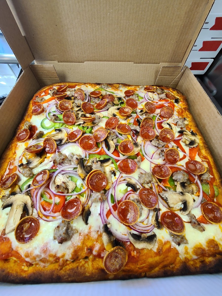 Ordered to go. These square pizzas are different but oh so yummy! The pies are huge and we ate on it for days! Highly recommend!
